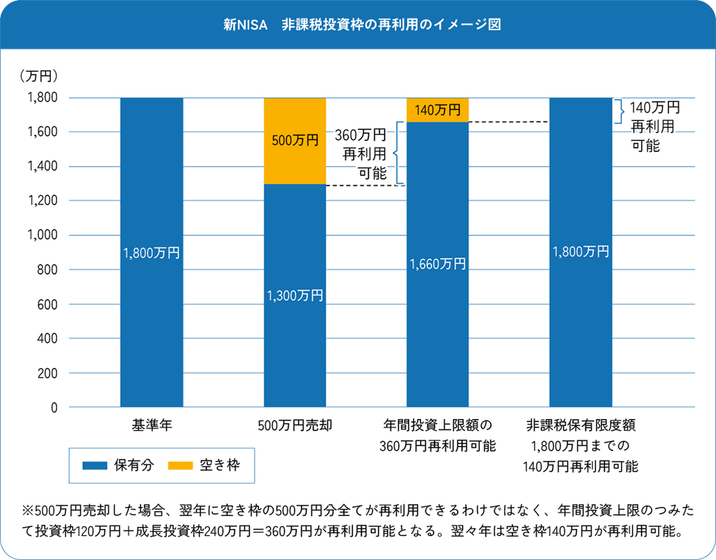 さらに新NISAの非課税投資枠は売却して再利用することも可能です。もし1,800万円使い切ったとしても、売却すれば年間投資上限額の範囲内で売却分(簿価分)を再利用できます。