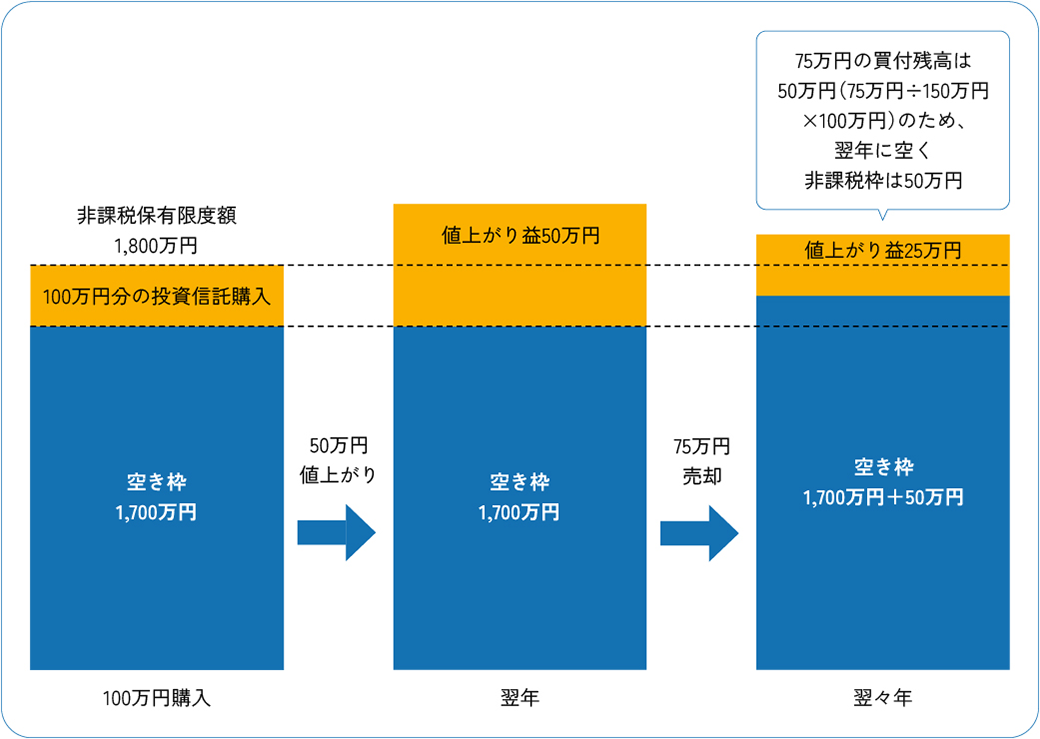 では、この投資信託を75万円売却したらどうなるでしょうか。この75万円の買付残高は50万円(75万円÷150万円×100万円)のため、翌年に空く非課税枠は50万円となります。