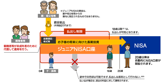 - ※2)口座開設者が18歳(注1)になるまでに、ジュニアNISA口座から払出しを行う場合は、過去の利益に対して課税され、ジュニアNISA口座を廃止することになります。(注2)